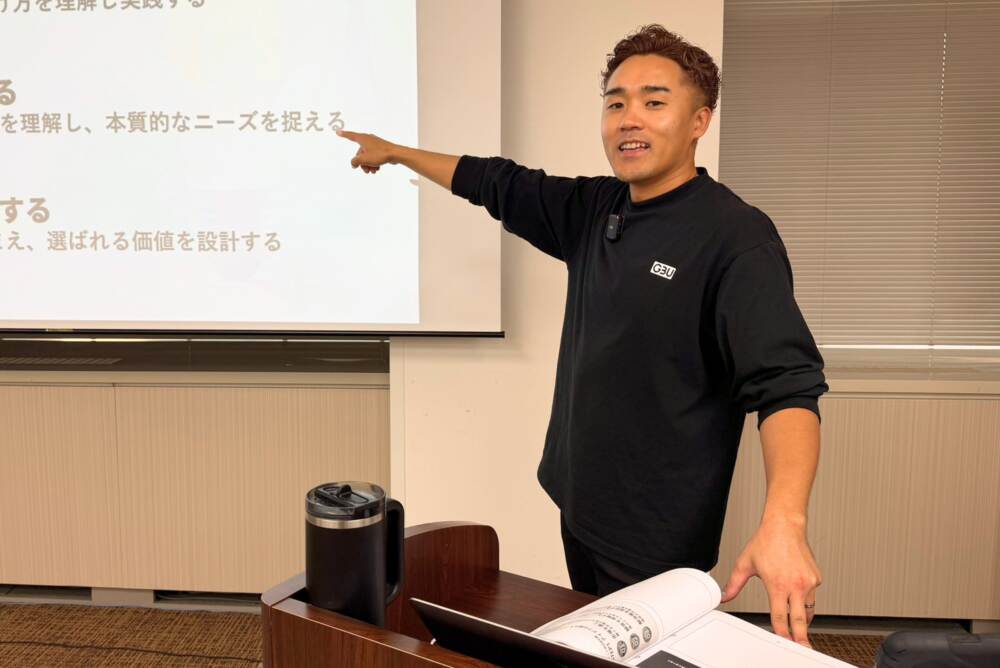 弊社の事業は、マーケティングの研修事業とコンサルティング事業の二軸で展開しています。もともとは営業領域からスタートしたのですが、売り方だけを強化しても市場は本当の意味で良くならないと感じ、商品そのものの価値や見せ方を磨くことに重心を移してきました。現在は、既存商品の売上が伸び悩んでいる企業に対する改善支援や、新商品の開発、さらには新規事業の立ち上げまで、一気通貫でサポートしています。研修では年間約300社が参加し、学びながら自走できる力を身につけていただいています。
